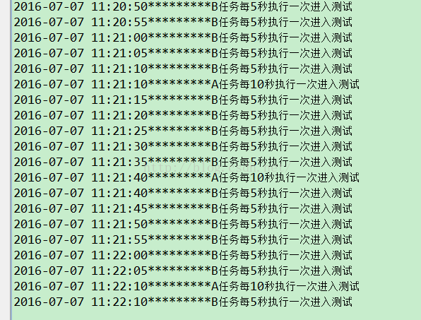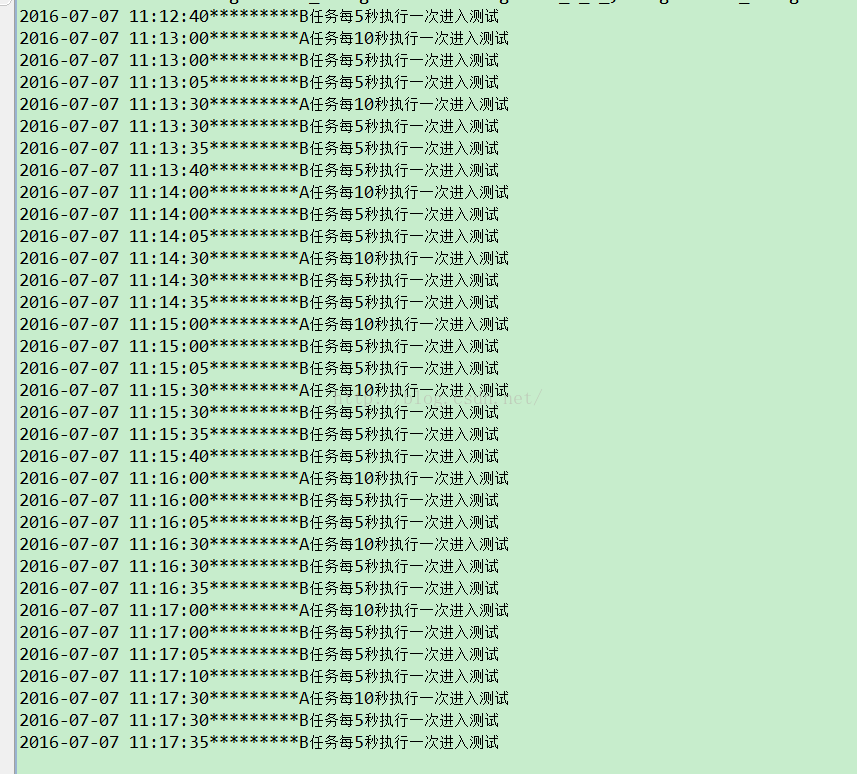 System.out.println(sdf.format(DateTime.now().toDate())+"*********B任務(wù)每5秒執(zhí)行一次進入測試");