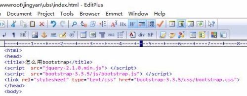 4.雙擊用editplus編輯器打開(kāi)index.html文件,你也可以用別的編輯器,記事本也可以;接著便是重點(diǎn),在head頭部寫(xiě)入引入bootstrap的內(nèi)容,見(jiàn)圖: