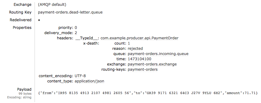 2016-09-07 21:56:55.401 WARN 11995 --- [cTaskExecutor-1] o.s.a.r.r.RejectAndDontRequeueRecoverer : Retries exhausted for message (Body:'{"from":"RS32 5346 0536 6006 4886 88","to":"FI61 8364 3364 9834 16","amount":45.57}' MessageProperties [headers={__TypeId__=com.example.producer.api.PaymentOrder}, timestamp=null, messageId=null, userId=null, receivedUserId=null, appId=null, clusterId=null, type=null, correlationId=null, correlationIdString=null, replyTo=null, contentType=application/json, contentEncoding=UTF-8, contentLength=0, deliveryMode=null, receivedDeliveryMode=PERSISTENT, expiration=null, priority=0, redelivered=false, receivedExchange=payment-orders.exchange, receivedRoutingKey=payment-orders, receivedDelay=null, deliveryTag=31, messageCount=0, consumerTag=amq.ctag-vd18OXS9PSOeJmBQLY4o-w, consumerQueue=payment-orders.incoming.queue])