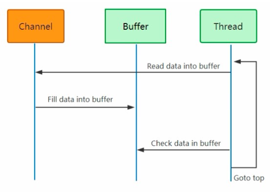 通道是數(shù)據(jù)的載體,緩沖區(qū)是數(shù)據(jù)存放的地方,線程從緩沖區(qū)中檢查數(shù)據(jù)并每次通知通道