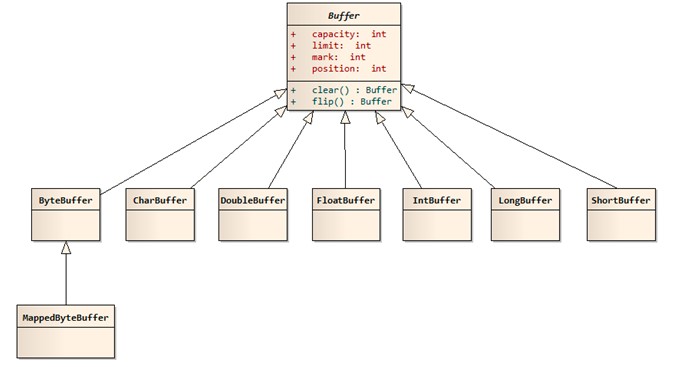 緩沖區(qū)常見類型: ByteBuffer 、 MappedByteBuffer 、 CharBuffer 、 DoubleBuffer 、 FloatBuffer 、 IntBuffer 、 LongBuffer 、 ShortBuffer 。