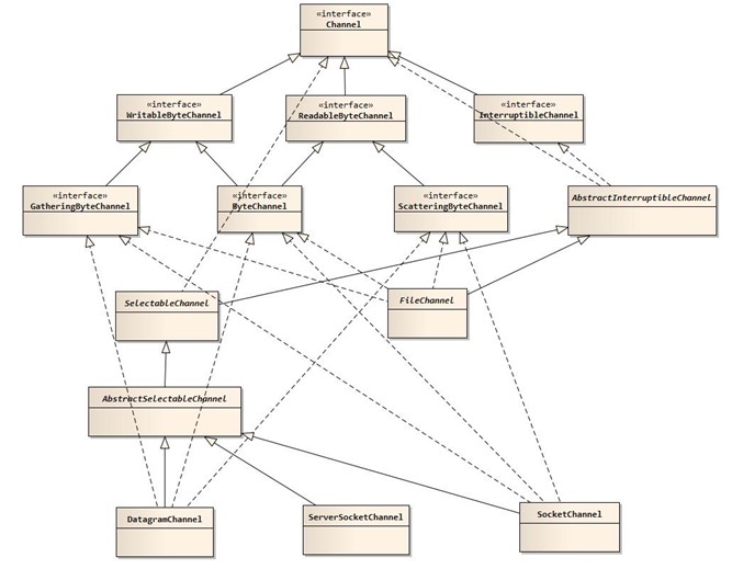 在 NIO 中,提供了多種通道對象,所有通道對象都實現(xiàn)了 Channel 接口。它們之間的繼承關(guān)系如下圖所示: