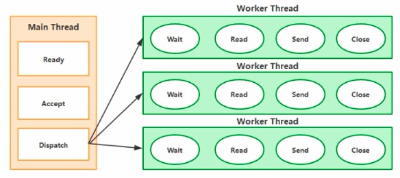 傳統(tǒng)的服務(wù)器/客戶端模型將基于 TPR(每個請求的線程)。服務(wù)器將為每個客戶端請求創(chuàng)建一個線程。該線程單獨處理客戶端請求。這個模型的一個問題是線程的數(shù)量急劇增加。大量線程會增加服務(wù)器的開銷。為了避免這個問題,大多數(shù)實現(xiàn)都采用線程池模型,并設(shè)置線程池中的最大線程數(shù),這帶來了新的問題。如果線程池1線程中有200個線程,有200個用戶在下載大文件,那么第201個用戶的請求無法及時處理,即使第201個用戶只想請求幾個KB大小的頁面。傳統(tǒng)的 Sorvor/Client 模式如下: