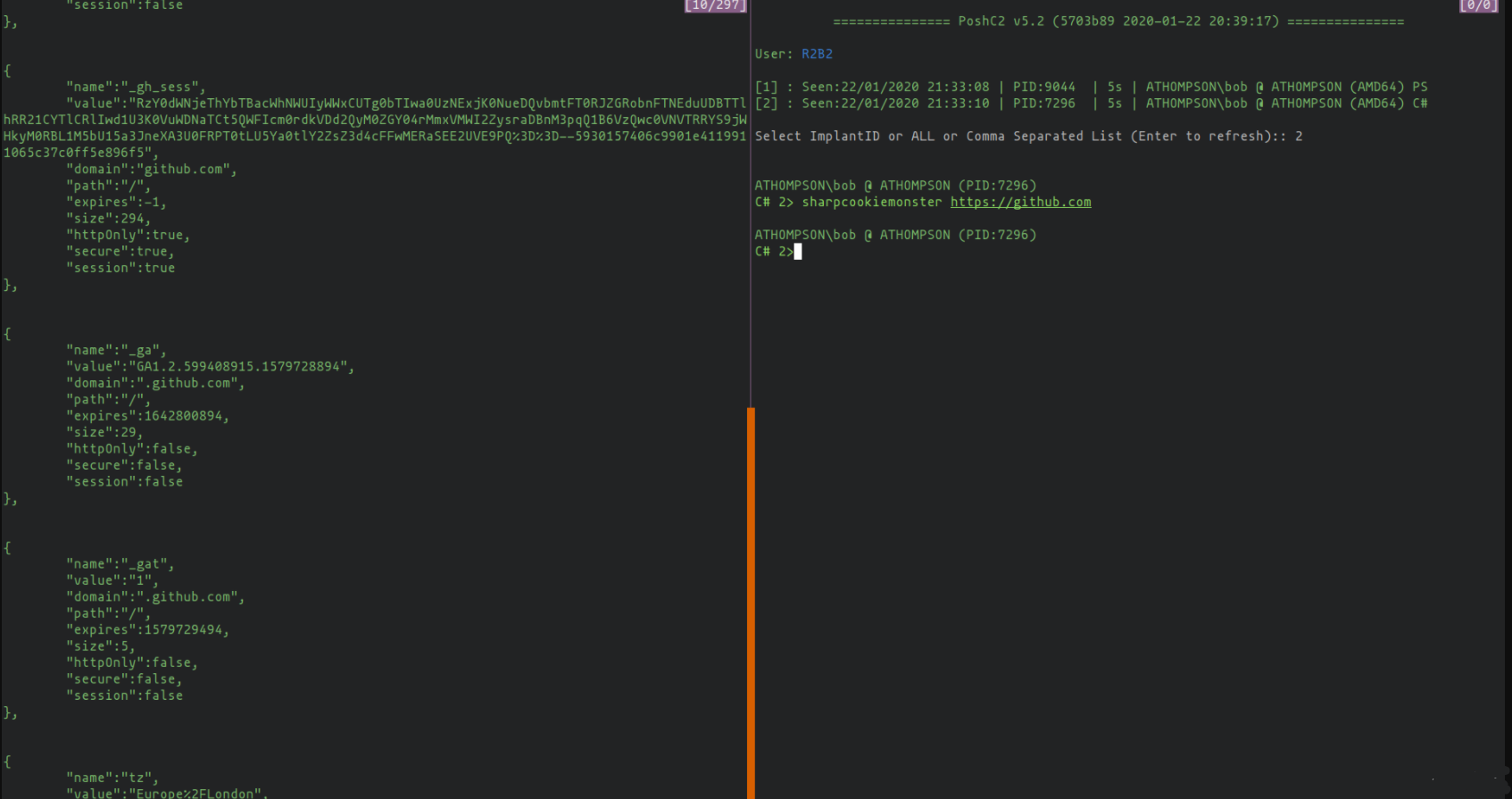 如您所見,它可用于提取session,httpOnly并通過C2傳輸cookie。它還已作為模塊添加到PoshC2中,并設(shè)置了自動加載和別名功能,因此可以使用來簡單地運行它sharpcookiemonster。