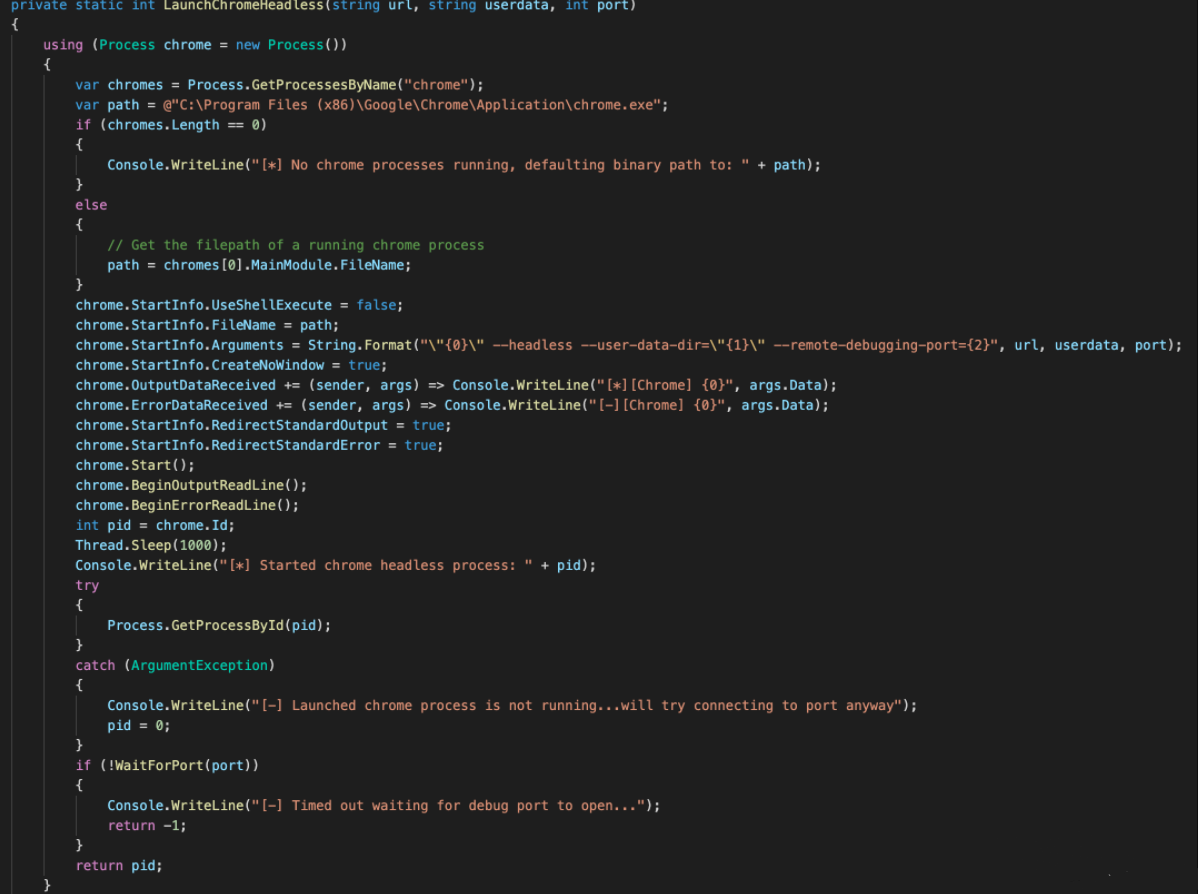 在后臺,這是通過首先啟動Google Chrome來實現(xiàn)的。我們首先枚舉任何正在運行的chrome.exe進程以提取其鏡像路徑,但是如果失敗,則默認為C:\ Program Files(x86)\ Google \ Chrome \ Application \ chrome.exe。然后,我們啟動該可執(zhí)行文件,設(shè)置適當(dāng)?shù)臉酥静⒃撨M程的輸出重定向到我們的stdout,以便即使在C2通道上運行它時也可以查看它是否出錯。