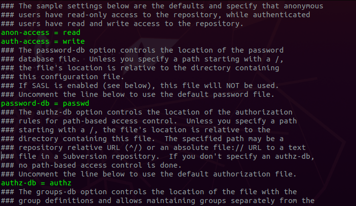 修改 repository 下的配置文件 /conf/svnserve.conf