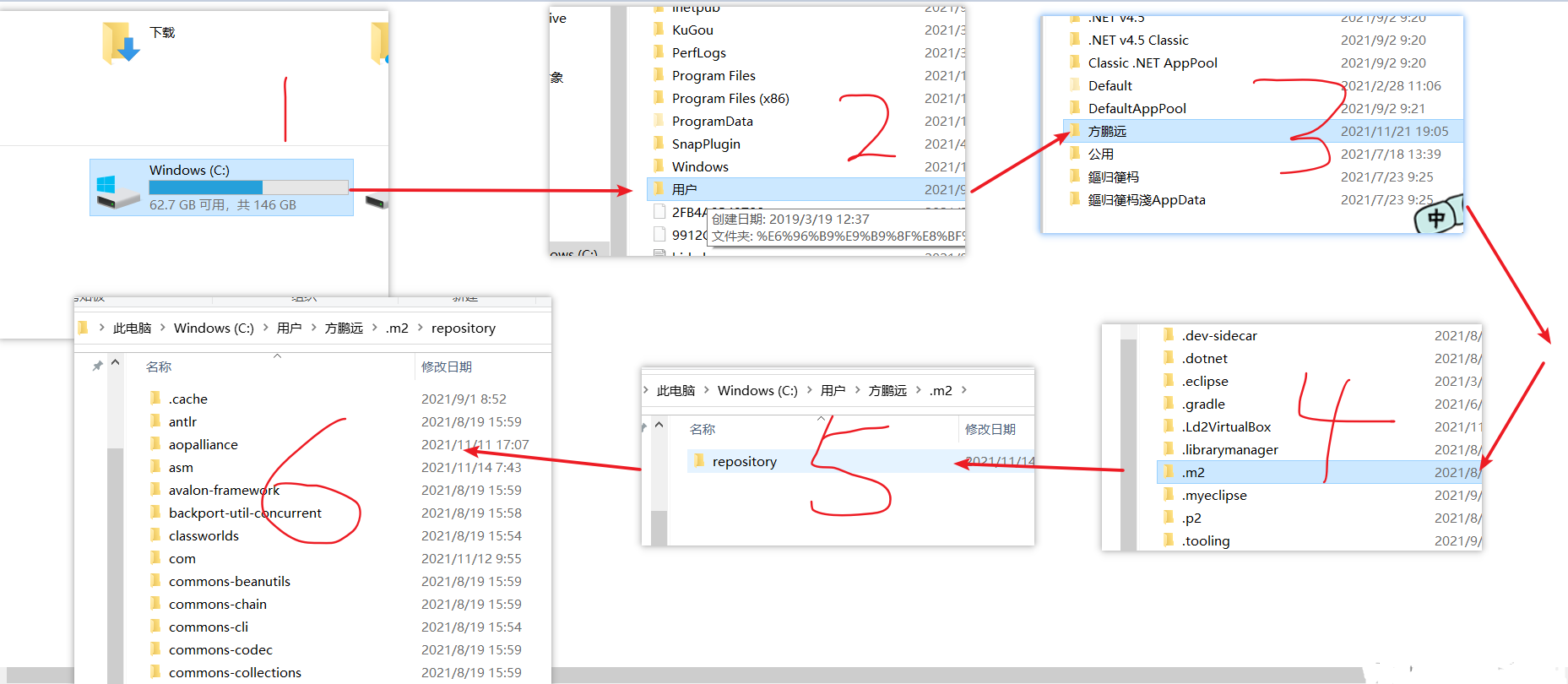 1.打開C盤,在用戶目錄下找到本機(jī)的用戶文件夾,在文件夾中找到**.m2的文件夾,就是存放maven文件的地方了,里面有個repository**(意思為“倉庫”)文件夾,所有使用過的maven文件都在這里了。