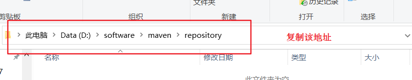 2.除C盤外,在其他盤(D盤、E盤等等)新建一個maven文件夾,在maven文件夾中新建一個repository文件夾,進(jìn)入repository文件夾內(nèi),復(fù)制地址欄中的路徑備用;