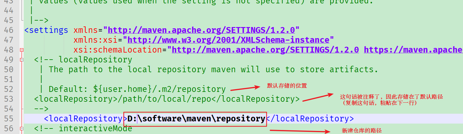 4.在打開的setting.xml中找到 localRepository 標(biāo)簽處,大概在53行處,輸入 localRepository 標(biāo)簽,在標(biāo)簽中間粘貼新建倉庫的地址;