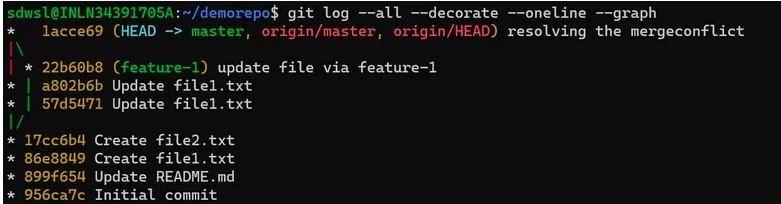 如果此步驟成功完成,分支將與分支完全feature-1合并。master但是,如果 git 無(wú)法自動(dòng)解決這些合并沖突,它將失敗并出現(xiàn)合并沖突錯(cuò)誤。