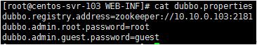 然后解壓,在webapps/ROOT/WEB-INF下,有一個(gè)dubbo.properties文件,里面配置指向 Zookeeper server的地址(使用的是Zookeeper 的注冊(cè)中心),如下所示
