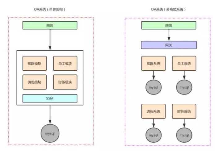 舉個例子,假設原來你做了一個OA系統(tǒng),里面包含了權限模塊、員工模塊、請假模塊、財務模塊,一個工程,里面包含了一堆模塊,模塊與模塊之間會互相去調用,1臺機器部署。