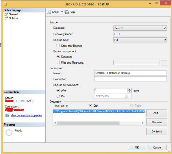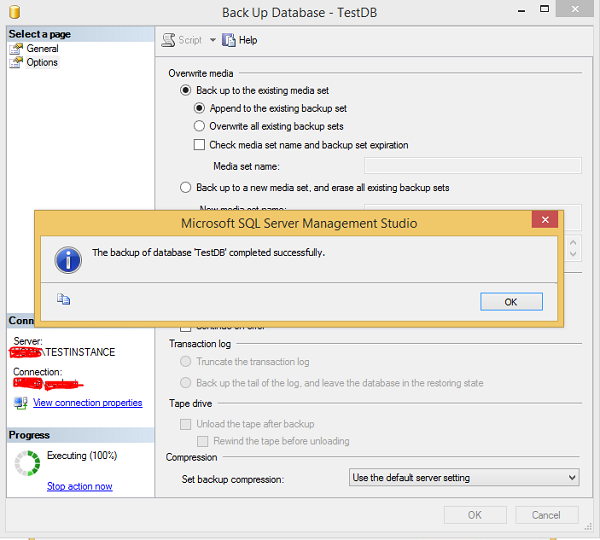 第 4 步 - 單擊 OK 創(chuàng)建“TestDB”數據庫完整備份,如以下快照所示。