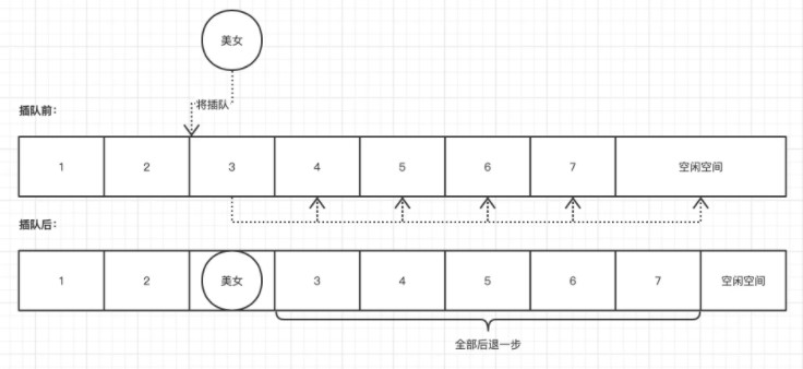 比如,買春運(yùn)火車票。每個(gè)人都排好隊(duì)。這位是美女,說……對(duì)排隊(duì)的第三個(gè)人,“大哥,請(qǐng)幫幫我,我媽在家病了,趕緊回去看看她,隊(duì)伍這么長(zhǎng),能不能把我放進(jìn)去在你面前?”你心軟,答應(yīng)了。身后的人都不得不退后一步。這個(gè)例子實(shí)際上已經(jīng)說明了線性表的順序存儲(chǔ)結(jié)構(gòu),插入數(shù)據(jù)時(shí)的實(shí)現(xiàn)過程。
