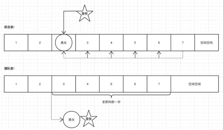 接下來,我們以上面的例子為例。這時(shí),一名警察出現(xiàn)了,對(duì)美女說道:“跟我去局。” 女人離開了隊(duì)伍。原來,她是個(gè)賣火車票的黃牛,裝窮排隊(duì)買票。然后排隊(duì)的人,都往前邁了一步。這是在線性表的順序存儲(chǔ)結(jié)構(gòu)中刪除元素的過程。