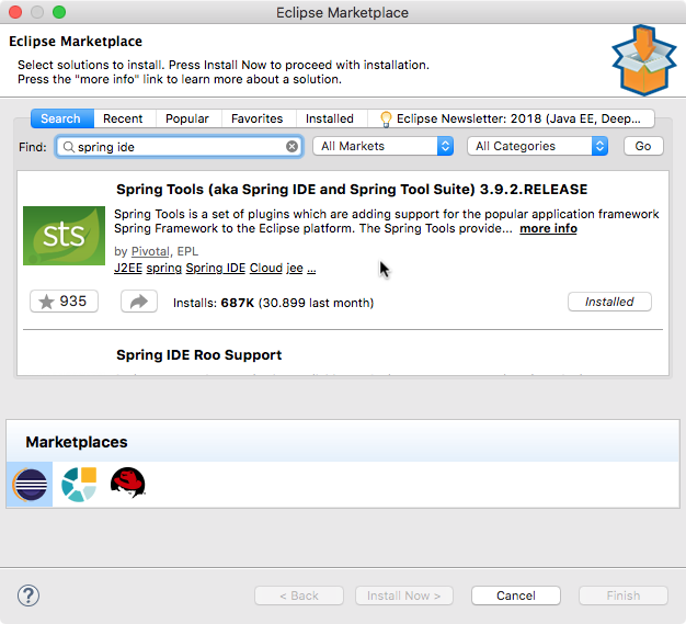 您可以使用 Eclipse Marketplace 將 Spring Tools for Eclipse IDE 安裝到現(xiàn)有的 Eclipse 安裝中。只需在 Eclipse 中打開市場客戶端,搜索 Spring Tools 并安裝“Spring Tools(又名 Spring IDE 和 Spring Tool Suite)”條目。