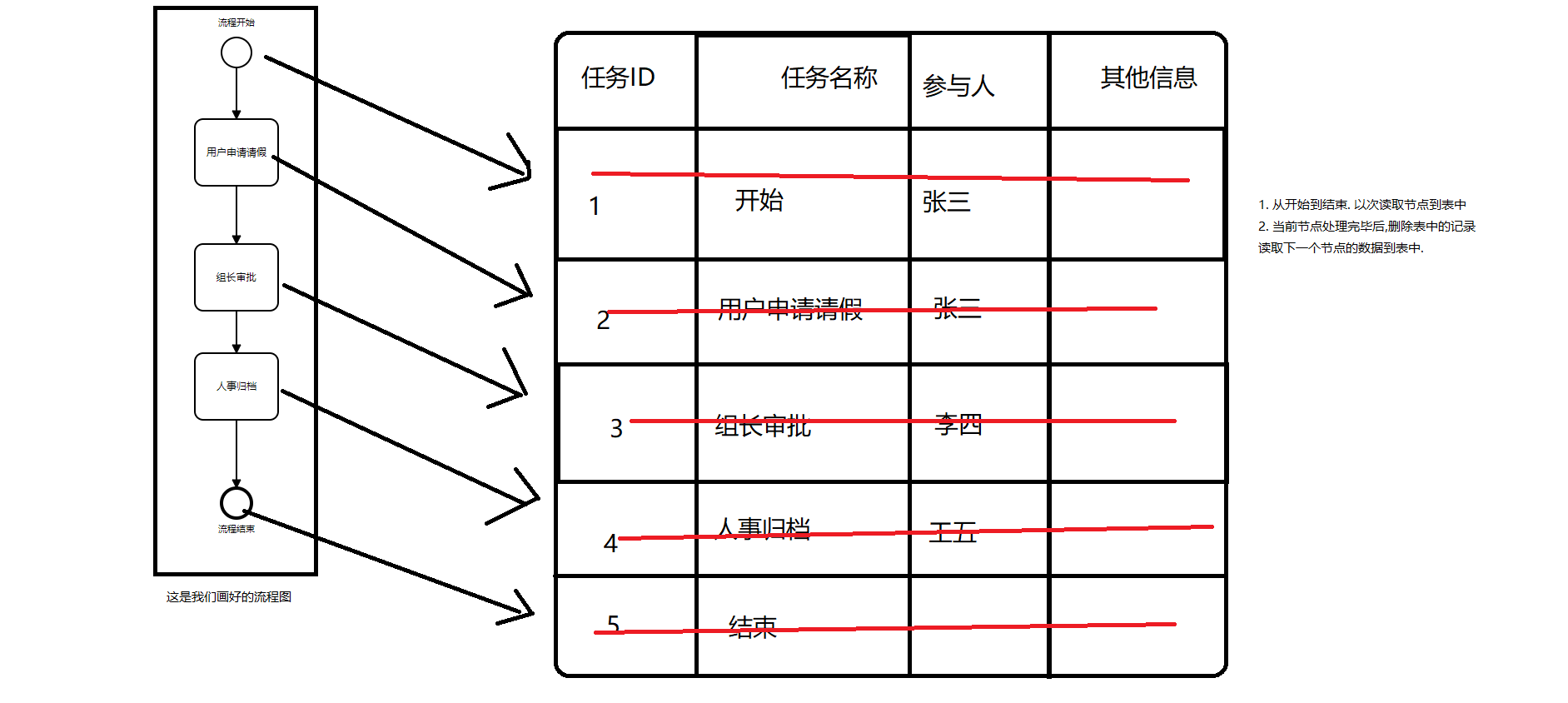 Activiti啟動流程時,會將第一個節(jié)點讀取到表中查詢到表中要處理的節(jié)點進行處理,處理完成之后會刪除這個節(jié)點,并且讀取下一個節(jié)點的數(shù)據(jù)存入到表中循環(huán)上一個步驟,直到結束。