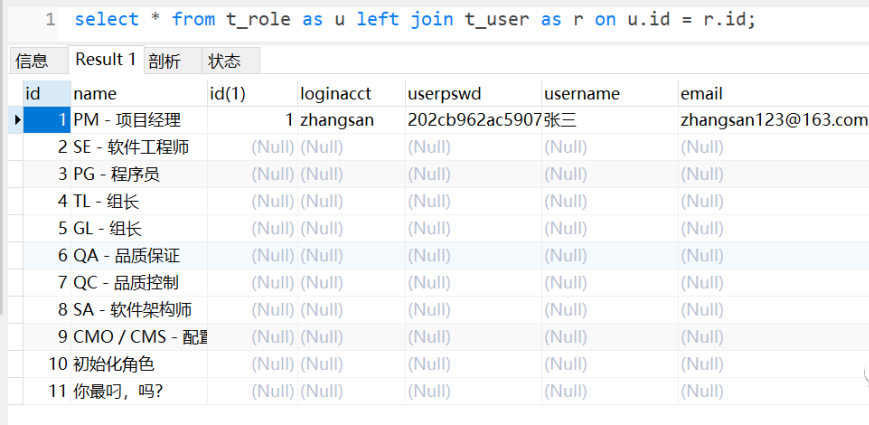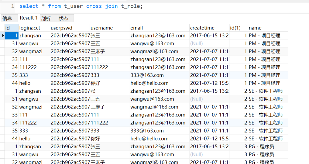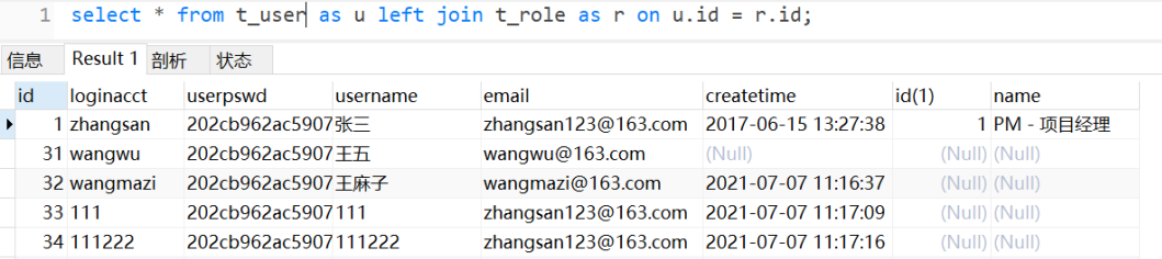大家在學(xué)習(xí)MySQL教程的時(shí)候會(huì)遇到多表查詢的問題,那么,MySQL多表查詢語句是什么?動(dòng)力節(jié)點(diǎn)小編來告訴大家。在實(shí)際開發(fā)中多表查詢是經(jīng)常遇到的,也是編寫sql的一個(gè)難點(diǎn),所以多表查詢是必須掌握的。其實(shí)單一的多表查詢是比較簡單的,困難的sql編寫一般會(huì)是多表查詢結(jié)合其他的一些關(guān)鍵字甚至函數(shù)。想要掌握好,除了了解關(guān)鍵字的用法,數(shù)據(jù)的存儲(chǔ)位置,就是多練習(xí)了。為方便舉例,用t_user和t_role這張表來舉例,t_user字段及數(shù)據(jù)如下: