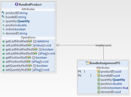 考慮下圖,它表達(dá)了產(chǎn)品和產(chǎn)品包(同樣是產(chǎn)品)之間的關(guān)系。通過 assignment class ,通過將(引用產(chǎn)品捆綁包的 UUID 的外鍵屬性)的值與(引用捆綁包中的產(chǎn)品的外鍵屬性)的值BundleAssignmentPO配對(duì),產(chǎn)品捆綁包與產(chǎn)品配對(duì)。兩個(gè)外鍵都映射到( ) 的主鍵。bundleIDproductIDProductUUID