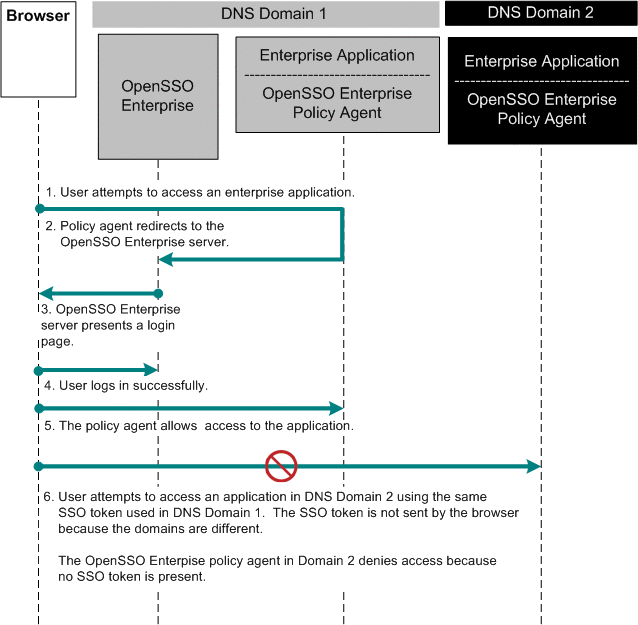 例如,OpenSSO Enterprise 和一些策略代理可能駐留在www.domain1.com中,而其他一些策略代理則駐留在www.domain2.com中。在對(duì) OpenSSO Enterprise 進(jìn)行身份驗(yàn)證期間,將 SSO 令牌設(shè)置為以domain1.com作為 cookie 域的瀏覽器。但是,當(dāng)瀏覽器訪問(wèn)domain2.com中受策略代理保護(hù)的資源時(shí),瀏覽器不會(huì)向策略代理提供 SSO 令牌。對(duì)于策略代理,沒(méi)有 SSO 令牌意味著用戶未通過(guò)身份驗(yàn)證。策略代理強(qiáng)制用戶進(jìn)行身份驗(yàn)證。相應(yīng) DNS 域中的 OpenSSO Enterprise 會(huì)看到瀏覽器確實(shí)具有有效的會(huì)話 SSO 令牌。OpenSSO Enterprise 將瀏覽器重定向回原始請(qǐng)求的資源www.domain2.com創(chuàng)建重定向循環(huán)。