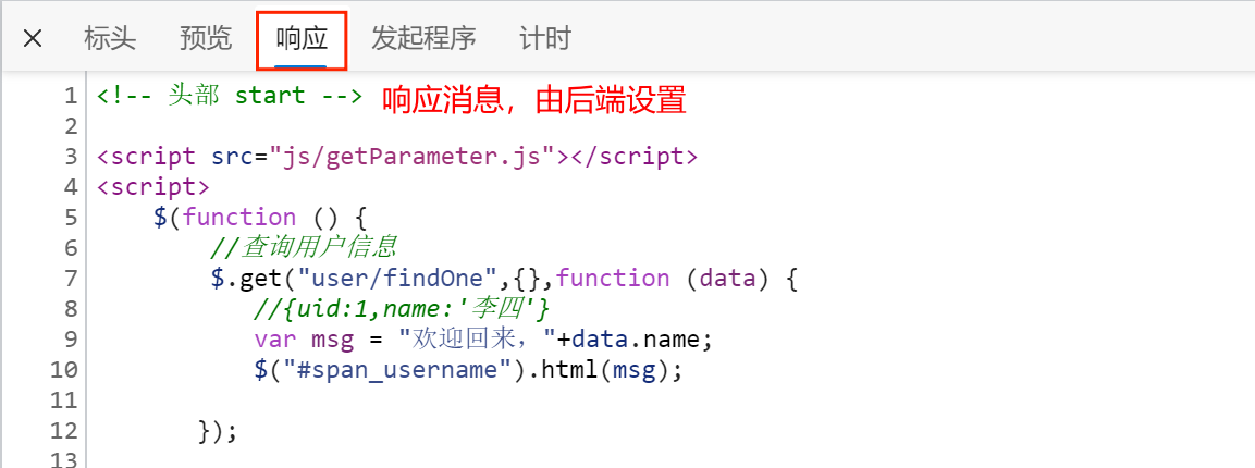 與request相對,response對象是設(shè)置響應(yīng)消息。在瀏覽器按下F12鍵--點(diǎn)擊網(wǎng)絡(luò)--ctrl+R: 可以查看用戶在瀏覽器端每次操作時(shí)瀏覽器向服務(wù)器發(fā)送的響應(yīng)消息。