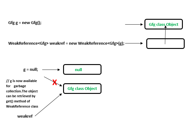 WeakReference<Gfg> weakref = new WeakReference<Gfg>(g);
