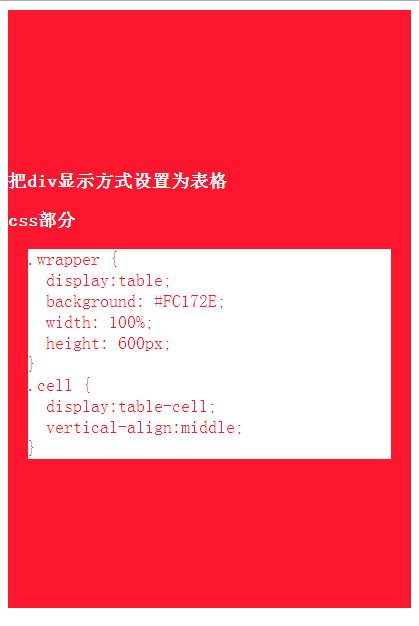 這個(gè)方法把 div 的顯示方式設(shè)置為表格,然后我們可以使用表格的 vertical-align property 屬性。