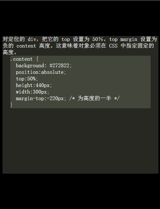 這個(gè)方法使用絕對(duì)定位的 div,把它的 top 設(shè)置為 50%,top margin 設(shè)置為負(fù)的 content 高度。這意味著對(duì)象必須在 CSS 中指定固定的高度。