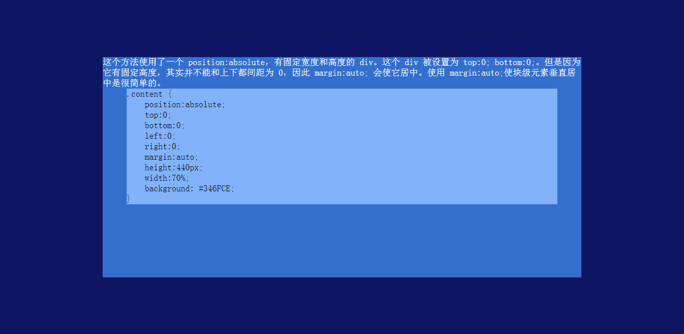 這個(gè)方法使用了一個(gè) position:absolute,有固定寬度和高度的 div。這個(gè) div 被設(shè)置為 top:0; bottom:0;。但是因?yàn)樗泄潭ǜ叨?,其?shí)并不能和上下都間距為 0,因此 margin:auto; 會(huì)使它居中。使用 margin:auto;使塊級(jí)元素垂直居中是很簡(jiǎn)單的。