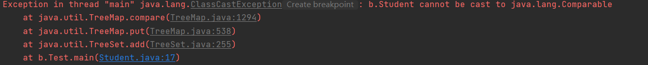 如果我們像使用HashSet一樣使用TreeSet這樣是否會報錯呢?