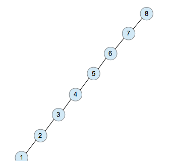 二叉搜索樹(shù)的深度越小,那么搜索所需要的運(yùn)算時(shí)間越小。一個(gè)深度為log(n)的二叉搜索樹(shù),搜索算法的時(shí)間復(fù)雜度也是log(n)。然而,我們?cè)诙嫠阉鳂?shù)中已經(jīng)實(shí)現(xiàn)的插入和刪除操作并不能讓保持log(n)的深度。如果我們按照8,7,6,5,4,3,2,1的順序插入節(jié)點(diǎn),那么就是一個(gè)深度為n的二叉樹(shù)。那么,搜索算法的時(shí)間復(fù)雜度為n。