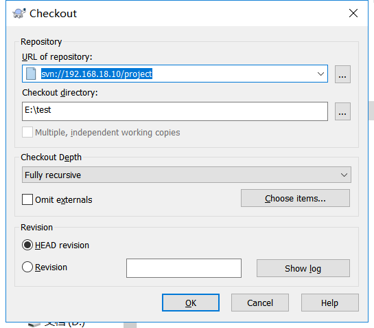# svn co svn://localhost/project /root/www --username svnuser1 --111111