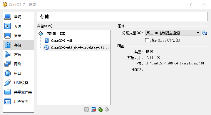3.然后再選中存儲,單擊沒有碟片,點擊右邊的光盤圖標,選擇你之前下載好的CentOS-7系統(tǒng)鏡像打開。