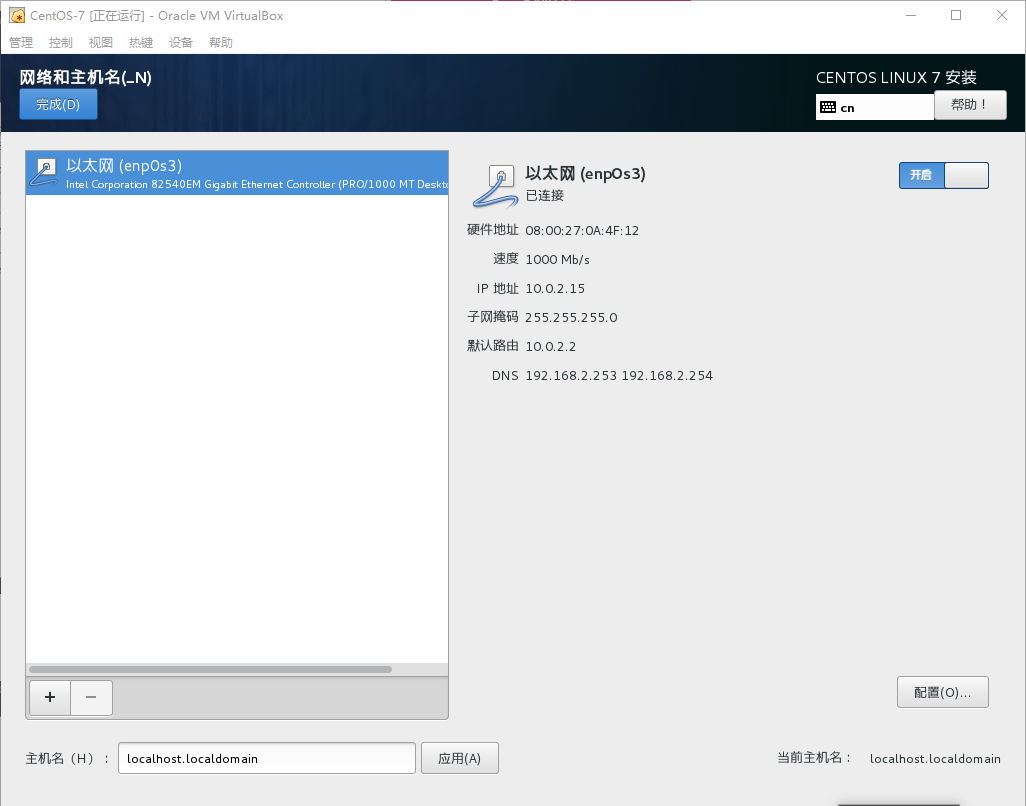 6.在網(wǎng)絡(luò)和主機名里把網(wǎng)絡(luò)打開,主機名默認就好,也可更改成你自己喜歡的。