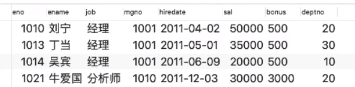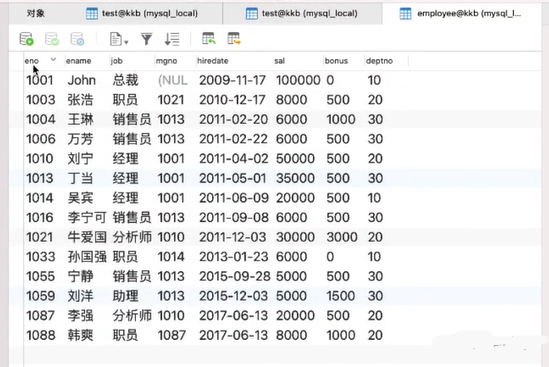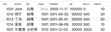 舉例:給定一個(gè)叫’employee’的數(shù)據(jù)表,表中第一行為字段名,有員工編號(hào)(eno)、名字(ename)、職位(job)、領(lǐng)導(dǎo)編號(hào)(mgno)、雇傭日期(hiredate)、工資(sal)、資金(bonus)、部門(mén)編號(hào)(deptno)這幾個(gè)字段;從第二行開(kāi)始為一條條的記錄。