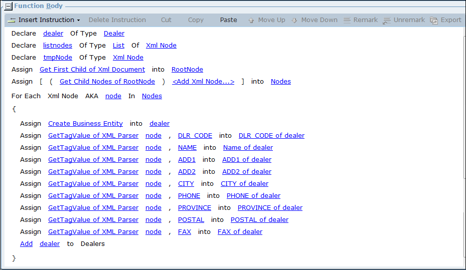 在Types選項(xiàng)卡的XML Parser下,添加Get Dealers函數(shù)。通過插入以下說明來執(zhí)行此操作:
