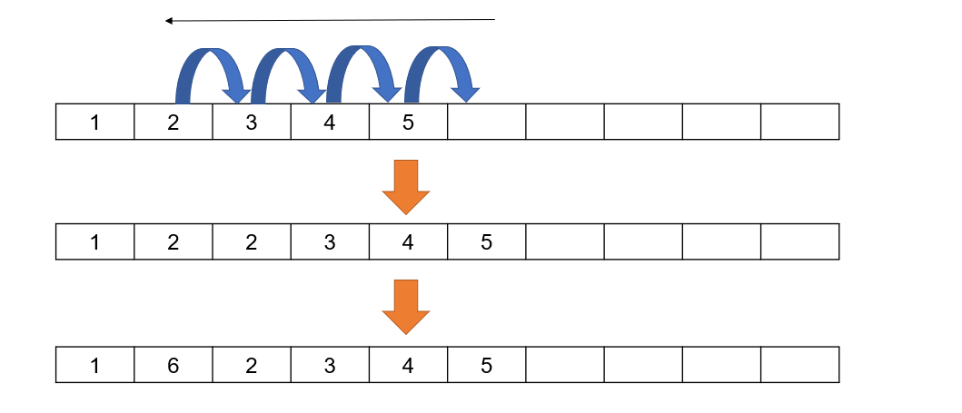 之后我們需要將元素6插入到位置2中,所以需要將位置2之后的元素全部后移一位,移動的時候從最后一個元素開始移動,使得后一個數據等于當前數據,也就是d a t a [ i + 1 ] = d a t a [ i ] data[i+1] = data[i]data[i+1]=data[i],一直到需要移動的位置2即可。之后將要插入的元素填入對應的位置即可,整個過程如下所示。