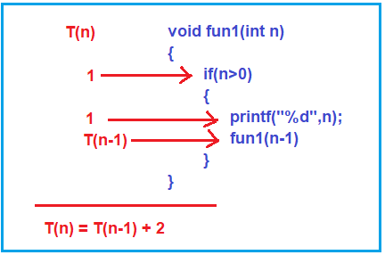 那么,讓我們看一下聲明。每條語句都需要一個單位的時間來執(zhí)行。請參閱函數(shù)內(nèi)部有一個條件語句(if (n > 0))。執(zhí)行需要多少時間,只需執(zhí)行一個單位時間。然后是一個printf語句,這也需要一個單位時間。