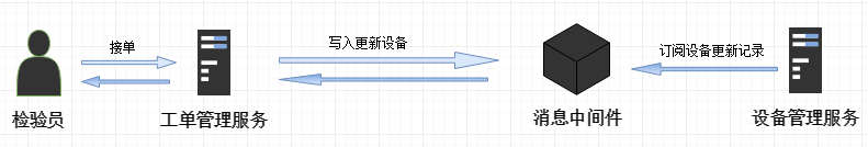 傳統(tǒng)的做法是,先調(diào)用工單管理的工單更新接口,成功之后再調(diào)用設(shè)備管理的設(shè)備更新接口,成功之后再返回操作提示給用戶。這樣做的缺點(diǎn)是應(yīng)用耦合,如果在派單操作的時候正好設(shè)備管理微服務(wù)掛了或者阻塞了,那么派單操作就會失敗或者要等待很長時間無反饋。另外如果設(shè)備管理的接口有變動,那么工單管理里面的代碼也要改動。