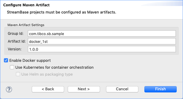 您可以通過(guò) Configure Maven Artifact 面板上的復(fù)選框?yàn)樾碌?StreamBase 項(xiàng)目啟用 Docker 支持。