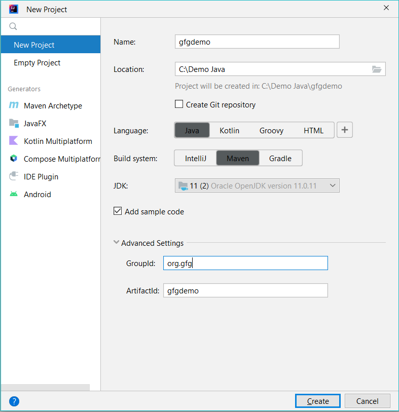 如果選中“添加示例代碼”框,則會生成一個簡單的 Main 類,其中包含 main() 方法。如果您打開 Advance 設(shè)置,那么您還可以修改您的GroupId和ArtifactId,如下圖所示。