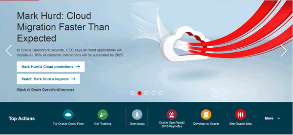 1.在瀏覽器中輸入 www.oracle.com,打開 Oracle 公司的官方網(wǎng)站。在首頁的欄目中選擇 Downloads 選項,如圖 1 所示。