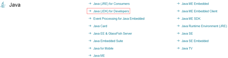 在轉(zhuǎn)向的頁面中選擇 Java for Developers 選項,如圖 2 所示。單擊 Java for Developers 超鏈接,進入 Java SE 的下載頁面。