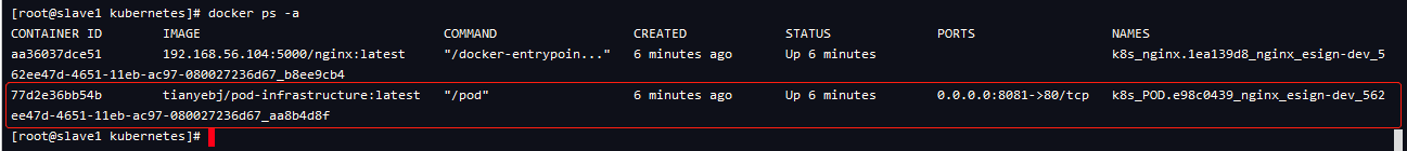 我們切換到主機名為 slave1(192.168.56.102)的節(jié)點,查看運行容器??梢园l(fā)現(xiàn) k8s 運行的是一個Pod基礎容器,我們在上一篇搭建k8s集群node節(jié)點時,配置過這個Pod基礎鏡像。Pod是K8s管理的最小單元。在這個Pod里運行的是Nginx容器。主機對Pod內部容器的端口映射是:8081->80。