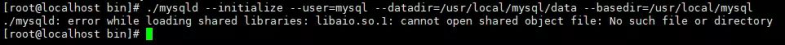[root@localhost bin]# ./mysqld --initialize --user=mysql --datadir=/usr/local/mysql/data --basedir=/usr/local/mysql
