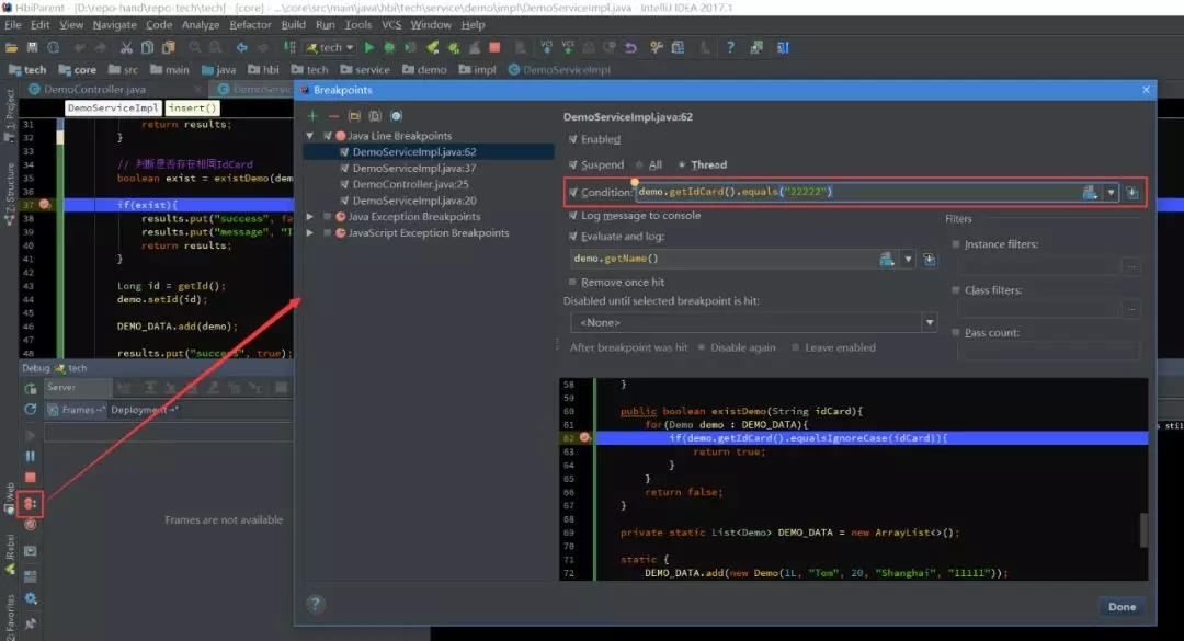 Java Line Breakpoints 顯示了所有的斷點,在右邊勾選Condition,設(shè)置斷點的條件。