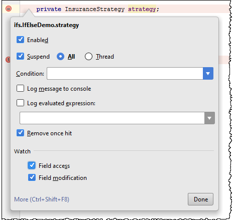 除了上述動作斷點之外,您還可以使用 字段觀察點。當與其關(guān)聯(lián)的字段被訪問時,該斷點將停止執(zhí)行。要創(chuàng)建現(xiàn)場觀察點,只需點擊 gutter 按住 Alt(macOS 中使用 Ctrl+Cmd)。