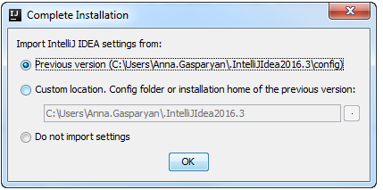 當(dāng)您第一次啟動(dòng) IntelliJ IDEA 時(shí),或者從先前版本升級(jí)后,將打開(kāi) “完整安裝” 對(duì)話(huà)框,您可以在其中選擇是否要導(dǎo)入 IDE 設(shè)置: