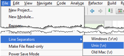 • 選擇主菜單上的文件 |行分隔符(File | Line Separators),然后從子選單中選取所需的行尾樣式。